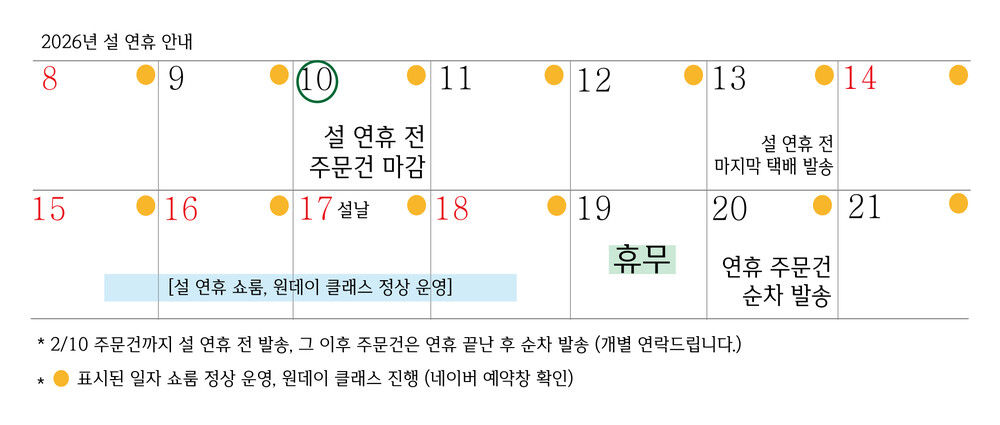 *설 연휴전 택배 발송한 주문건은 2/10 마감됩니다. 정확한 발송일자는 주문자에게 개별 연락드립니다.